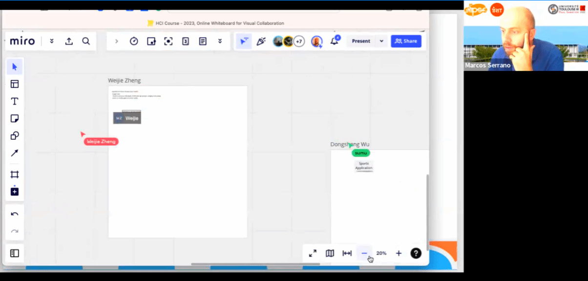 的学生授课。在正式开课之前,Marcos教授先向同学们做了自我介绍,然后以学术汇报的形式向大家简要介绍了他最近的科研成果。教授全程通过miro平台与学生们进行互动,了解了同学们的专业方向以及对人机交互的认识,以此作为本次人机交互课程的引入。