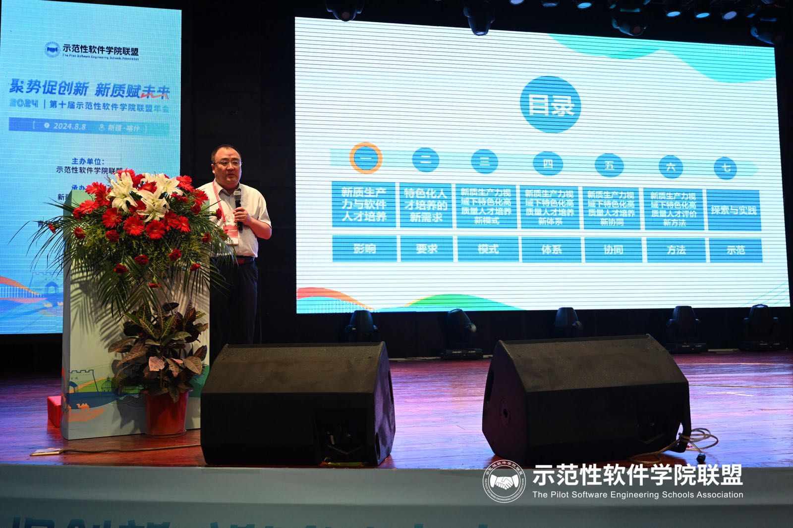 郑江滨受邀在大会发表主题演讲,围绕新质生产力视域下的软件人才培养的新模式、新体系、新协同及人才培养新方法等多个维度,分享了学院近年来推动软件教育持续优化与提升的经验与前瞻思考。他指出新质生产力的形成是由技术革命性突破、生产要素创新性配置以及产业深度转型升催生的结果,具有高科技、高效能、高质量的特征,软件人才培养与新质生产力是相互适应、促进与共同进化的,在新质生产力的驱动下,软件人才培养逐渐向新工科、大交叉、复合型、高质量的需求转变。学院通过系统规划学业、校企联合培养、“总师育人文化”融于课程建设、“情色小说