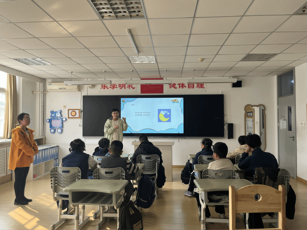 学生代表王皓、刘童耐心地向孩子们介绍软件科技与航天航空的相关概念,配合生动的图片、有趣的故事和形象的比喻,将复杂的科技知识转化通俗易懂的有趣知识。