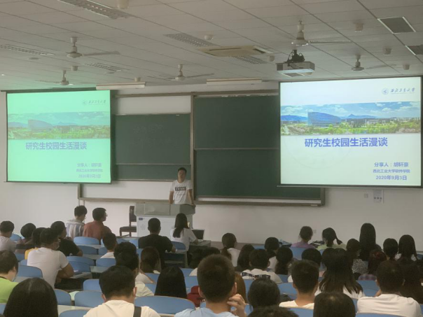 第二位和同学们分享经验的是2019级学长向征同学,经过简单的自我介绍,向征同学重点介绍了他对于研究生期间学习生活的感悟与理解,从论文、竞赛、专利和项目四个同学们感兴趣的方向依次介绍他在研究生期间的种种经历,为同学们接下来的学习生涯指出方向,随后介绍了他在生活方面给予大家的建议,要大家坚持每天锻炼,调整好作息时间,珍惜自己的身体。最后分享经验的是2019级学长廖佳豪同学。廖佳豪同学从自己学习科研的经历出发,分享了自己和导师在生活和科研过程中的一些细节,告诉同学们要注重和导师交流的效率,从而提高自己的工作能力,培养自己坚持不懈的品质,不管是学习科研还是生活中都将受益匪浅。三位高年级学长真诚的分享出他们学习工作期间的思考与感悟,打动了在座的新生们,更是为他们即将到来的研究生生活提供一颗定心丸,帮助他们更快适应研究生阶段的新生活。