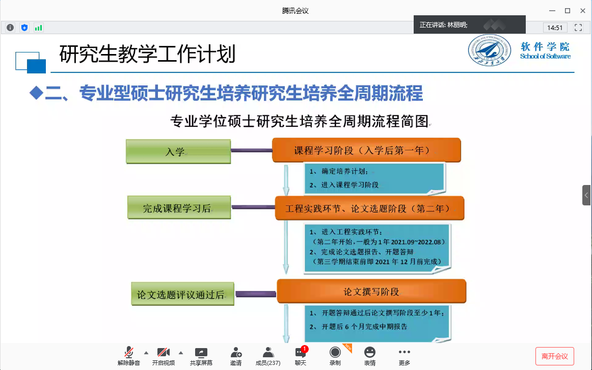 共招收2020级研究生287人,其中西安校区有255人,太仓校区32人。张琨老师对全体研究生新生表示热烈的欢迎。随后,林丽明老师对研究生课程计划和培养方案进行了详细的介绍,包括研究生培养周期流程、学生个人培养计划的制订、选课的具体情况和注意事项等。通过林丽明老师的介绍,研究生新生对未来三年的研究生教育有了整体的了解。