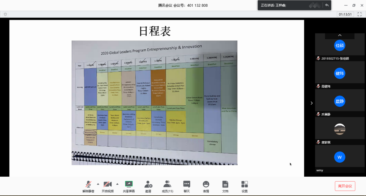 来自玛丽女王工程学院材料科学与工程专业的大三同学赵景城通过许多团队精心剪辑的视频向大家展现了自己的所感所想。他提到在项目中学员上午接受由澳洲企业家、企业高管以及墨尔本高等院校老师的授课,与老师同学们就企业文化、创新等话题展开深入讨论,下午则由墨大的学生带领奔赴澳洲多家资深企业深入实地参观学习,为丰富同学们的课余生活,项目还组织大家在专业人士指导下进行室内攀岩,大洋路游览,参观博物馆,游览动物园等。
