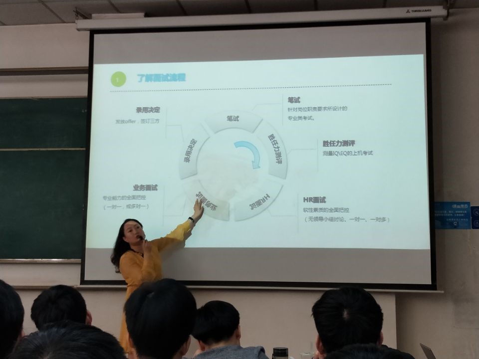 俗话说“知己知彼,百战不殆”,在招聘这场“战争”中,我们不仅要面对求职者之间的竞争,还要面对HR的考察。而竞争对手各有所长,变化百般,但所有HR的共性可谓是显而易见。所以要在这场较量中占得一定的先机,把握这种共性至关重要。马蕊老师讲到HR关注点有两个:应聘者和应聘职位的匹配度以及个人吸引点。匹配度主要由三部分构成:实习经验、院校及专业、课程和成绩。吸引点主要包括条理性、总结凝练、求职态度、学习能力、个性特点、特长和爱好等。在讲到求职态度的时候,她强调道细节体现态度,简历的“颜值”和“结构”可以体现应聘人对于应聘的态度。她给同学们讲道,简历一定要有突出点,硬性匹配度不够的话,吸引点一定要引人注目。