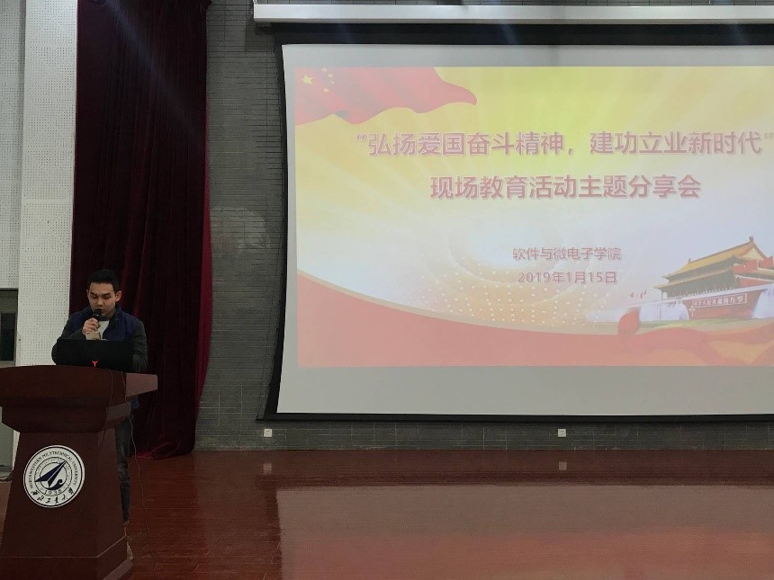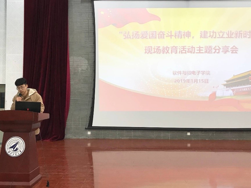 1月15日,软件与微电子学院在教西D100举办“弘扬爱国奋斗精神、建功立业新时代”现场教学活动分享会。本次活动由赴富平县和华县进行学习的何畅浩、尹望嵩、朱元哲同学为2018级本科生进行现场分享。