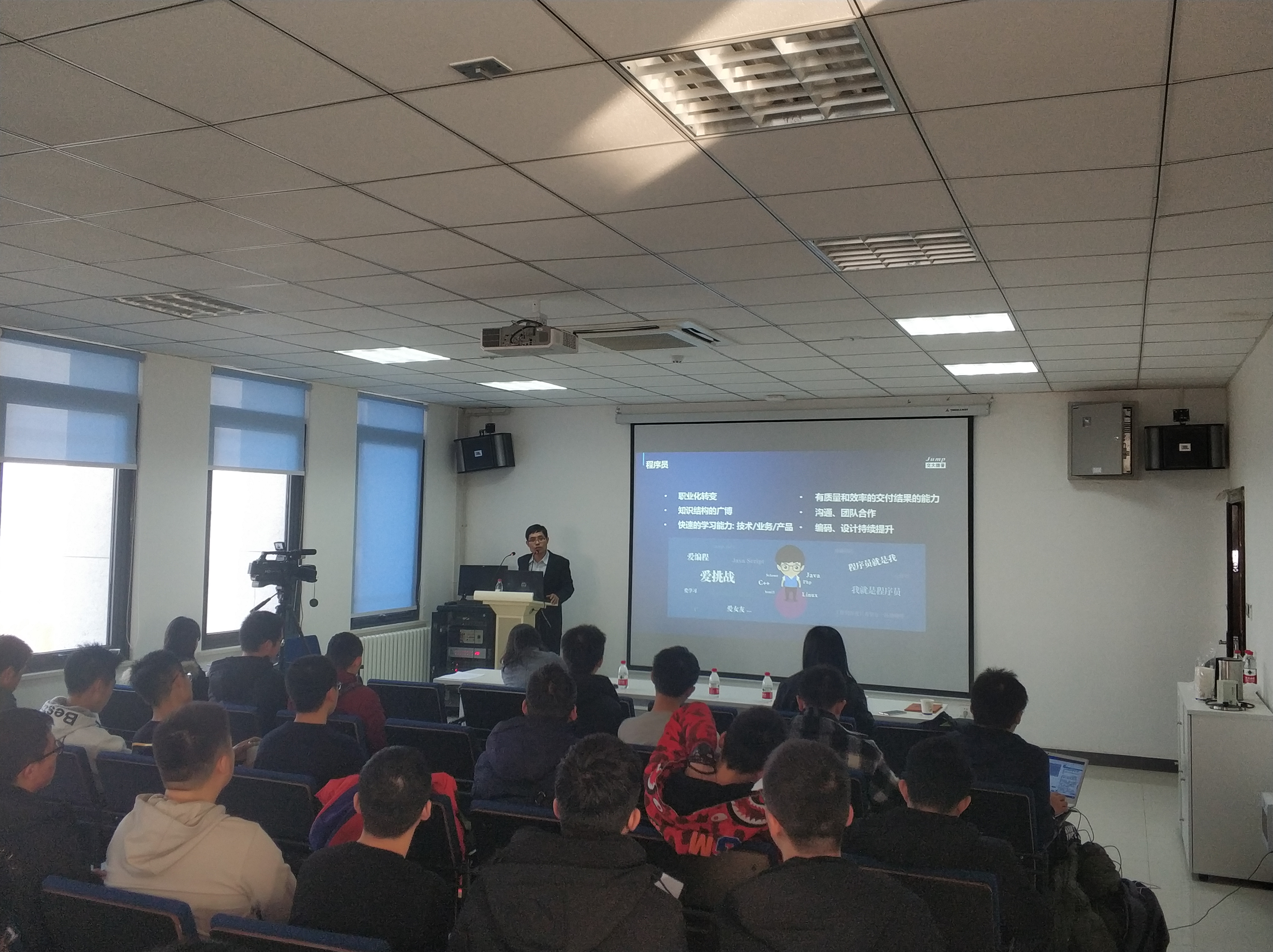 随后,何建锋讲述了自己的工作经历——从程序员、项目经理、技术研发中心主任到CTO的成长之路,他从一次次教训中总结经验努力拓展知识、深入学习,从技术人员成功成长为一名企业经营者。通过自己的经历,何建锋建议同学们重视培养快速学习的能力、有质量和效率的交付结果的能力、与同事合作沟通的能力、借助一切可以借助力量的能力,要在职业生涯中逐步明确自己的目标,不断提升自己,完成职业之路的规划和角色转变。