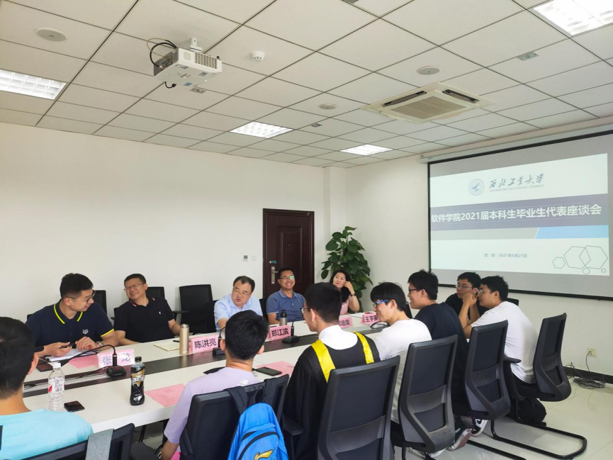 2021年6月21日上午11:00,情色小说 2021届本科毕业生代表座谈会在长安校区启翔楼303会议室进行。情色小说 党委书记陈洪亮、院长郑江滨、副院长郭培荣、党委副书记张龙、办公室主任王宇英、本科生教学秘书蔡康英、院长助理兼2017级本科生班主任魏倩茹、2017级本科生辅导员陈智通及十余名本科毕业生代表们共同参加,会议由张龙主持。