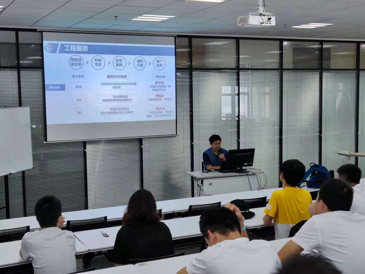 高利鹏老师主持会议,对长鹰公司的到来表示热烈欢迎。李晓钢总经理向老师和学生们介绍了北京天航长鹰公司的发展历程、战略目标、发展定位、区域布局,以及取得的成就。武宁老师向同学们详细讲解了环境与可靠性试验、软件测试、元器件检测等公司等主要业务,以及行业行情。