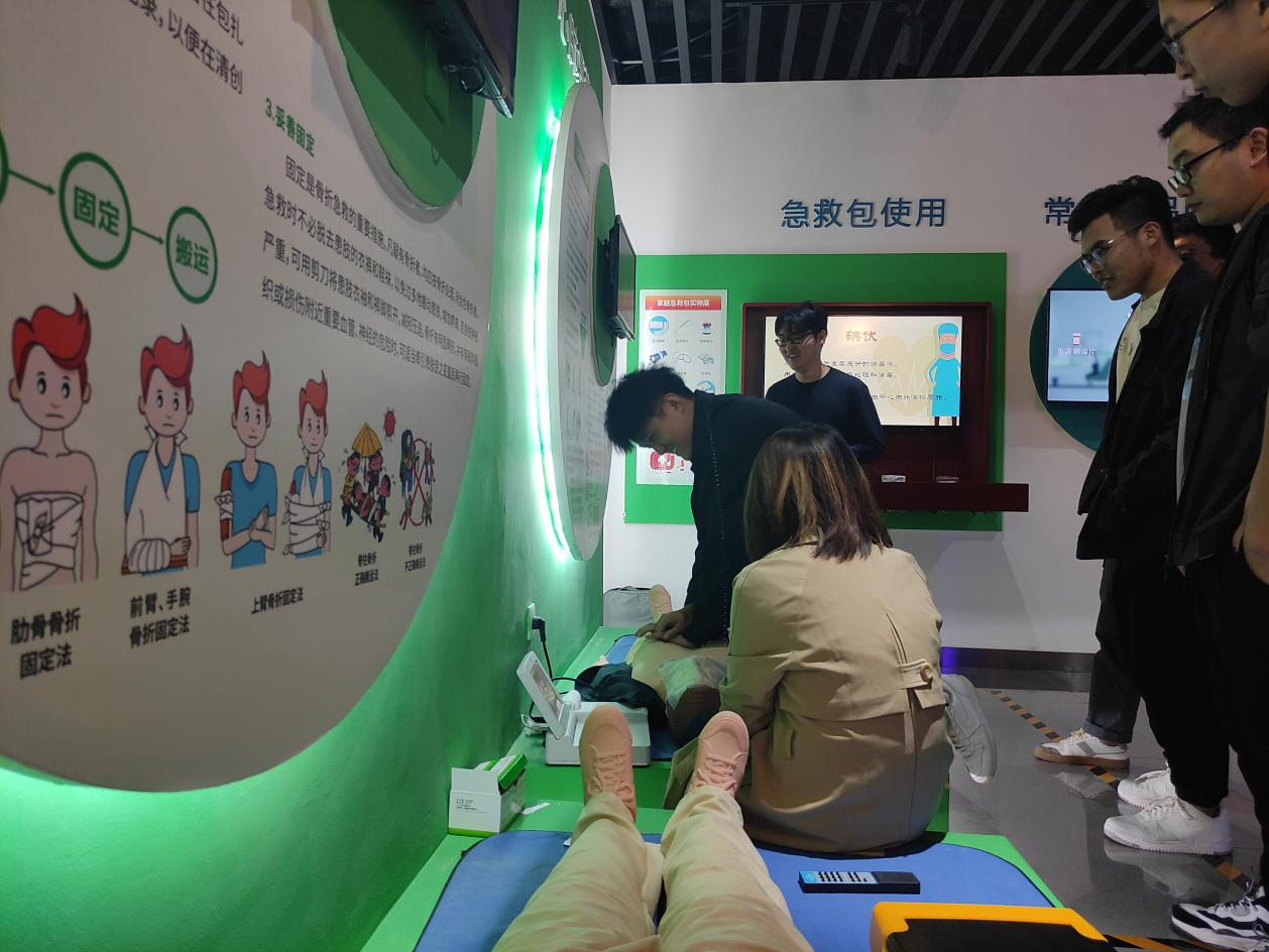 最后,讲解员对同学们进行了急救知识方面的扩充。在介绍了基本的急救常识之后,讲解员示范并指导学生进行心肺复苏训练,以应对突发状况。在进行心肺复苏时,首先要判断患者意识。大声地呼叫,看是否有反应。凑近他的鼻子、嘴边,感受是否有呼吸。其次,再开放气道后,找到按压的部位(沿着最下缘的两侧肋骨从下往身体中间摸到交接点),一手叠放于另一手手背,十指交叉,依靠上半身的力量垂直向下压,双手臂必须伸直,不能弯曲,压下后迅速抬起,频率控制在每分钟80-100次。每三十次按压后要进行一次人工呼吸。