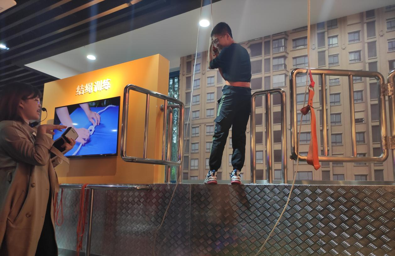 然后在讲解员的带领下,同学们了解到多项西工大楼宇的消防安全保障设施,包括楼宇内自动灭火器等。在进行简易的烟雾逃生训练之后,同学们体验了火灾发生时使用安全绳索从高楼降落的项目,陈晶同学谈到:正确使用安全绳索从高楼降落能够很好地保护自身不受伤害,通过实际的演练,对佩戴安全绳索的方法有了进一步的了解以及学习到了如何从高空安全降落的知识,受益匪浅。