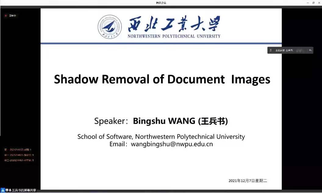 王兵书老师先从阴影的概念展开介绍,通过日常生活中的例子引证阴影去除对现实生活的意义。接下来梳理了近年来文档图像阴影移除方向的研究进展。