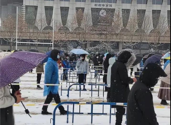 今年研究生考试到来的日子,也是今年西安深冬第一场大雪的日子,早晨七点一刻,我们志愿者提前来到考场。本次我负责组织考生进入考场并维持秩序。刚开始时,我们采用本校外校双通道的形式进行排队,但发现随着考生人数的增多,两支队伍的长度出现了明显的差异,为了让考生能够更快更及时的进入考场备考,我们改成混合的形式进行,极大的减少了考生进入考场的时间。
