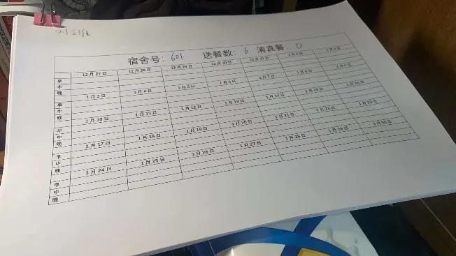 在12月29日,刘立维负责带领志愿者去云天苑餐厅二楼取餐,与餐厅负责人对接,及时在志愿者群中汇报装车及发车情况,并与其他志愿者一起将E座1329份餐食快速有序地送到宿舍,保障后续志愿者能够快速将餐食分发到各楼层。