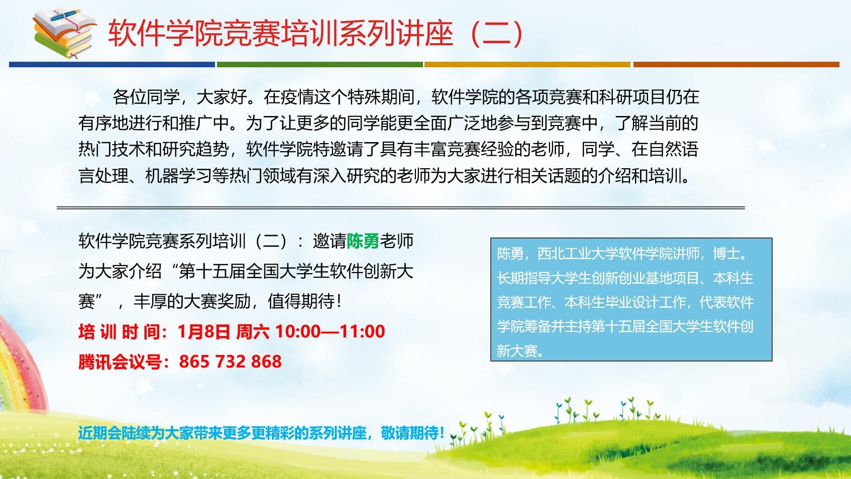 竞赛系列培训(二)︰1月8日周六10:00—11:00,学院邀请陈勇老师为大家介绍“第十五届全国大学生软件创新大赛”,丰厚的大赛奖励,值得期待!