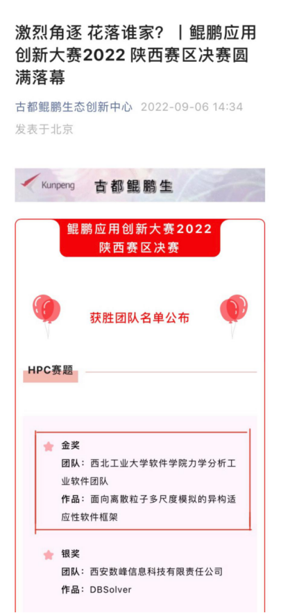 季哲副教授带领力学分析工业软件团队,凭借《面向离散粒子多尺度模拟的异构适应性软件框架》斩获HPC赛题唯一金奖,团队将作为HPC赛道陕西赛区代表队参加全国总决赛。
