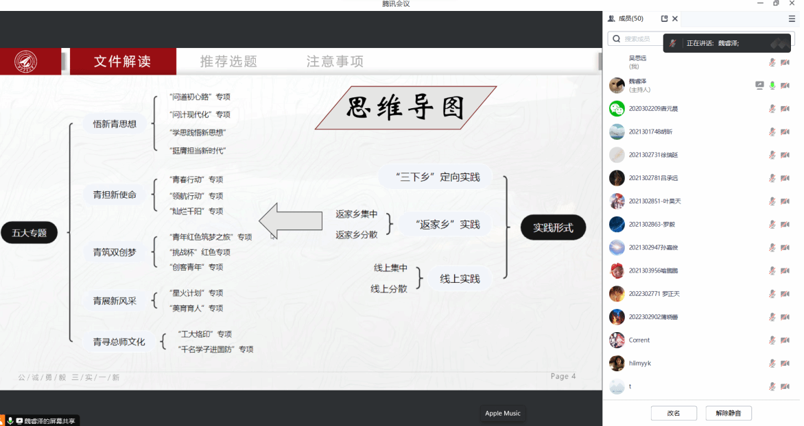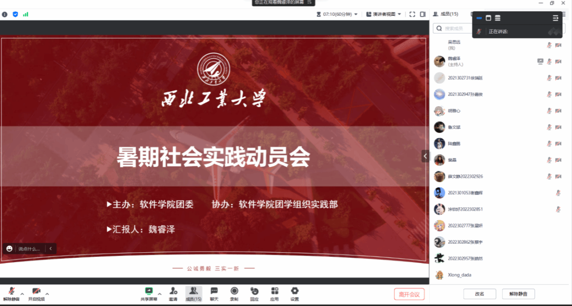 会议伊始,魏睿泽同学对暑期社会实践中五大专题下不同专项的内容进行了解读,并为大家讲解了三种实践形式的区别。之后推荐的一些选题,主要推荐大家选择“创客青年”“星火计划”“青春行动”三个专项,并分别介绍了三个专项的优点,鼓励大家积极参与本次实践。之后对实践注意事项进行讲解,强调了实践内容、实践创新、新闻稿的发布三个方面需要注意的事项。