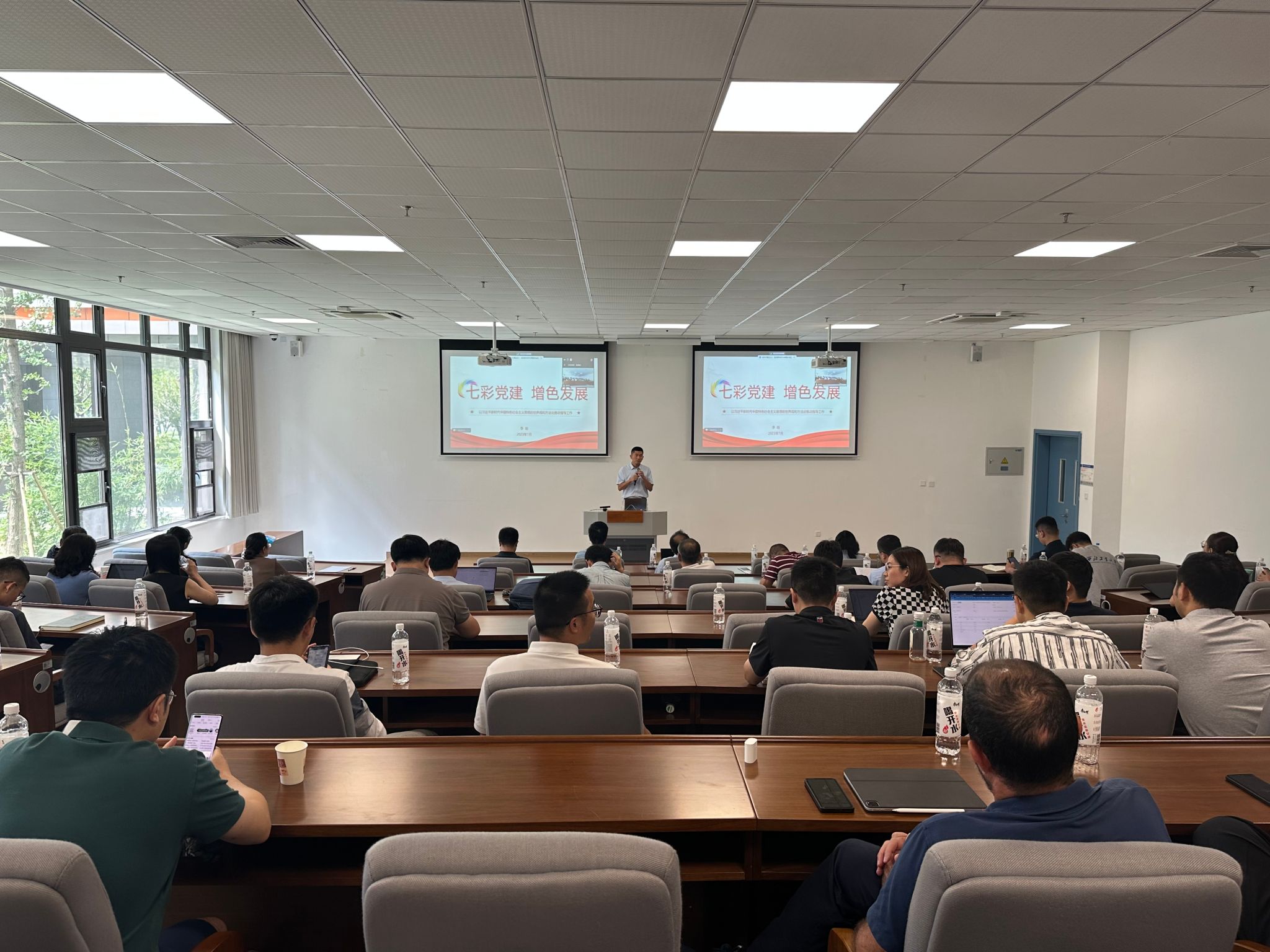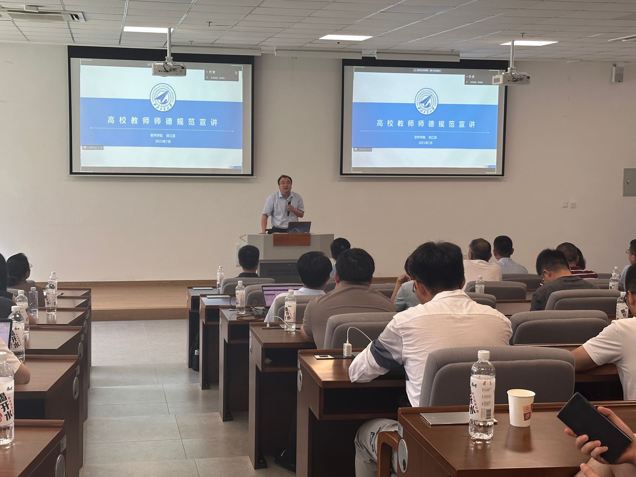在太仓•智汇港B座103报告厅召开全体教职工大会,集中学习师德师风并安排部署学院发展相关工作,学院领导班子成员以及全体教职工参加了会议,部分教师线上参会,会议由学院副院长郭培荣主持。
