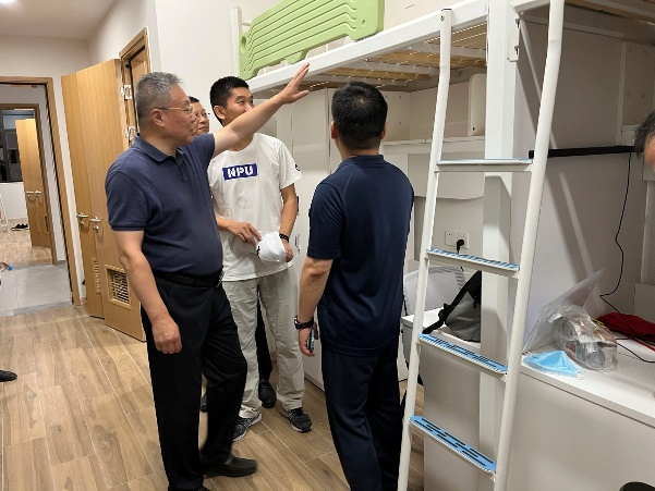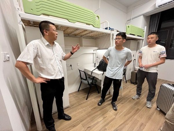 随后,党工委书记万小朋、副书记陈洪亮带领太仓智汇港工作人员到学生宿舍进行了走访和慰问,同时,学院领导和老师们对同学们在未来两周的生活环境进行了查看并指导学生安全使用宿舍的电器设备。