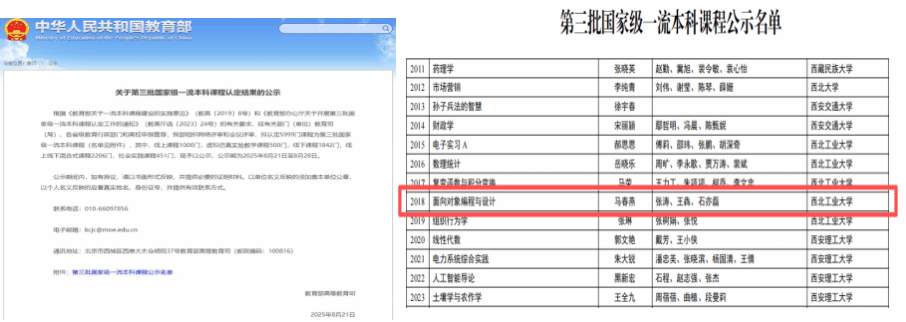 近日,教育部公示了《第三批国家级一流本科课程认定结果》,情色小说马春燕教授团队主讲的《面向对象编程与设计》课程成功入选国家级线上线下混合式一流课程。此次获评,不仅为学院教育教学改革树立了标杆,更为推动高质量数智课程体系建设注入了新动能。