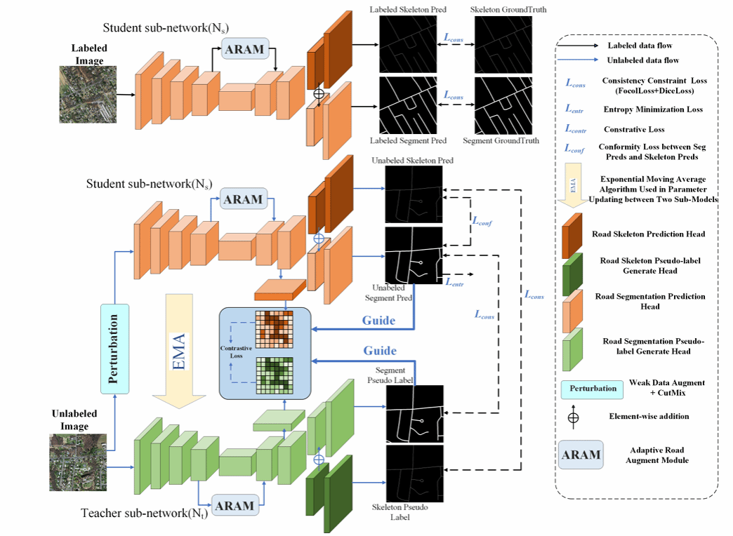 第二篇论文《MCMCNet: A Semi-Supervised Road Extraction Network for High-Resolution Remote Sensing Images via Multiple Consistency and Multitask Constraints》(作者中文名:高利鹏,周义青,田江涛,蔡文静,吕志勇)。该工作提出了一种高效的半监督道路提取模型,旨在减轻人工标注成本以及减轻模型对标签信息的依赖,通过设计一个被指导的Patch级对比学习模块来挖掘无标签数据中潜在信息最终得到更为准确的伪标签来指导模型训练,同时通过对道路中心线的约束来保证道路提取的连通性。