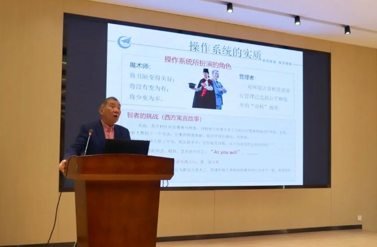 叶宏在报告中运用哲学的原理思想解析了操作系统的实质,以及在设计中的应用。他围绕操作系统的实质、起源学说、基本概念中的哲学问题进行讲解,并简要介绍操作系统基本功能中存在的十个哲理问题,最后向与会师生介绍后时代的操作系统发展。
