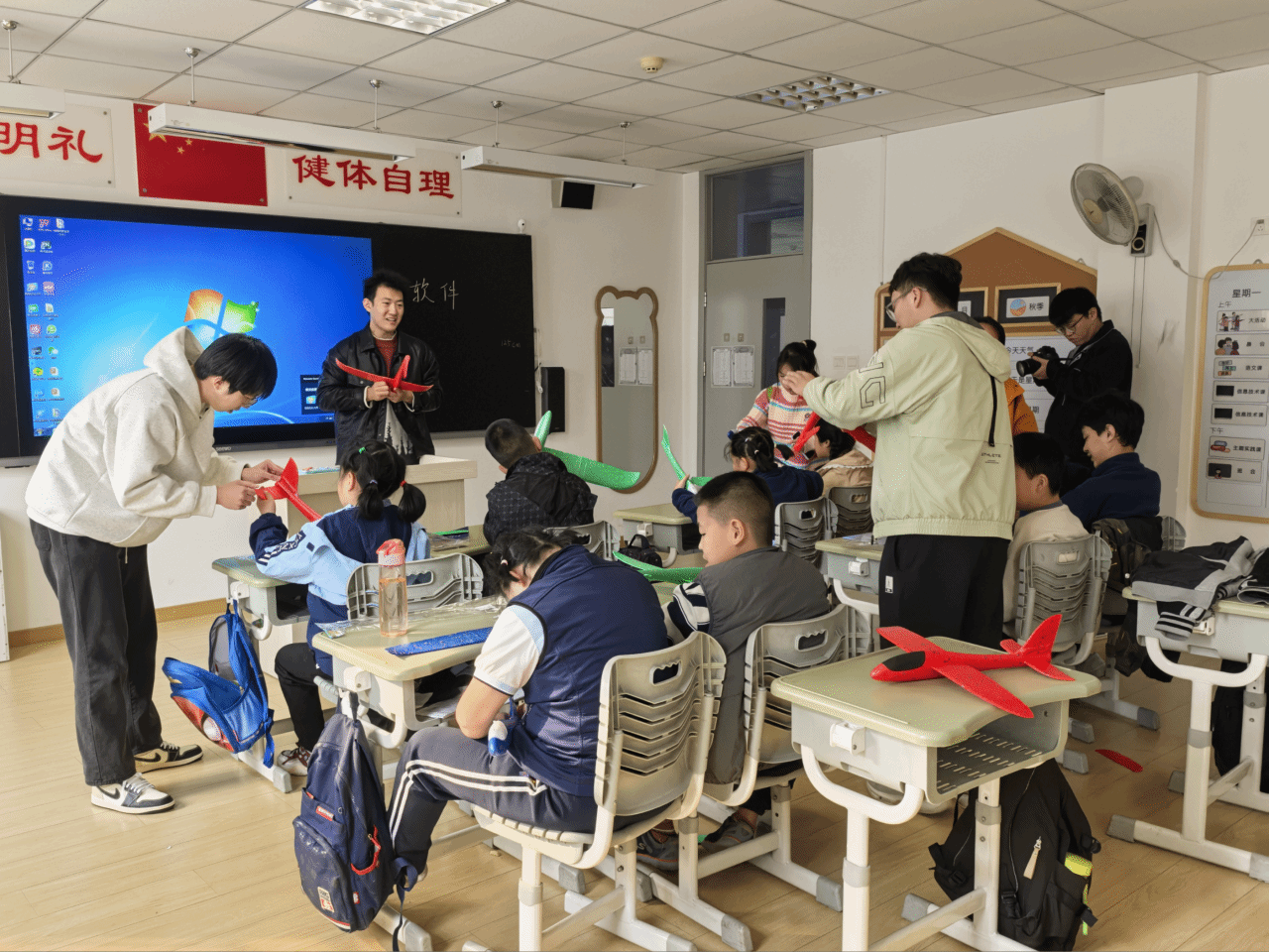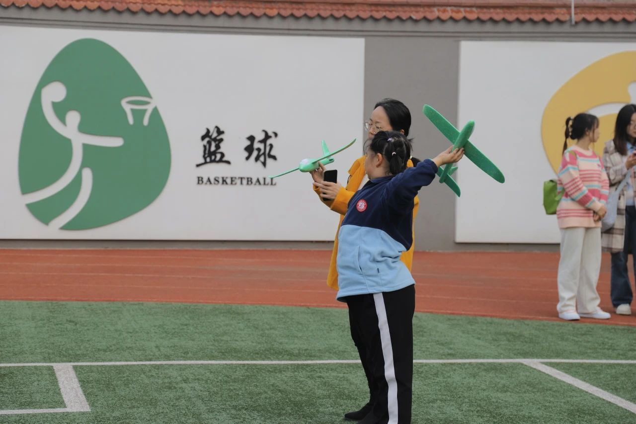 在组装飞机模型环节,孩子们在学生代表的悉心指导下认真进行模型拼接,并前往操场一同放飞。随着飞机模型在空中自由翱翔,孩子们的欢呼声此起彼伏。在这个过程中,孩子们不仅锻炼了动手能力,更加深了对飞机结构的理解。