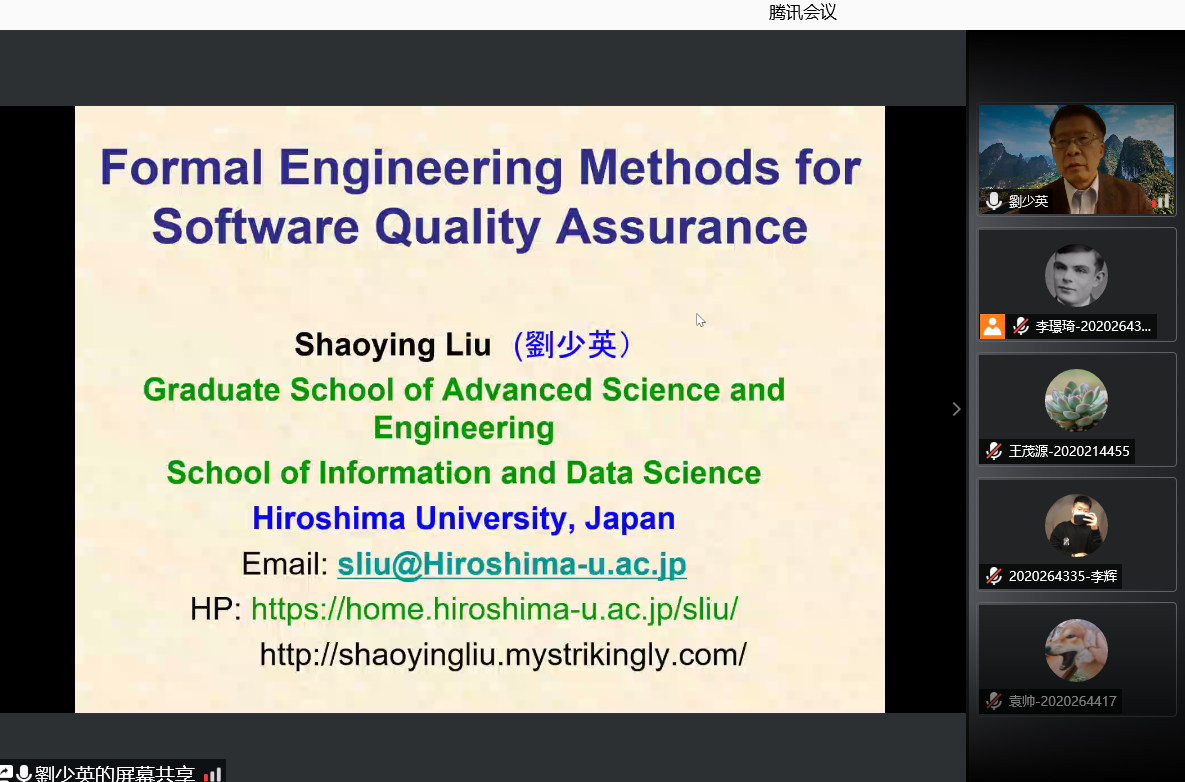 为进一步加强学院全英文课程体系建设,助力学院人才培养工作,4月19日,由日本计算机专家、广岛大学刘少英教授主讲的“软件质量保证的形式化工程方法”(Formal Engineering Methods for Software Quality Assurance)正式开讲。应情色小说邀请,刘教授自2017年起每年春季学期为情色小说研究生和高年级本科生开设该门专业课程,截至今年已连续开设5期。受疫情影响,刘教授无法入境与学生面对面,本次课程沿用线上授课的形式。为了保障课程能够在保证质量的前提下顺利开讲,学院安排外事秘书和研究生助教对接课程、测试授课系统等,确保课程能够如期上线开讲。经过前期的努力,课程终于如期顺利上线,得到了学生的广泛认可。