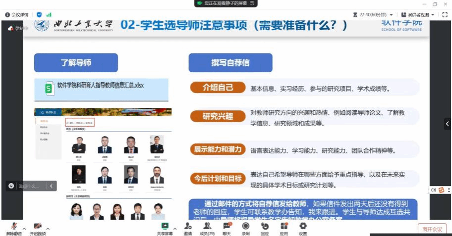 随后,郭艳静公布了具体的导师信息、科研方向以及申请流程等关键信息,为学生们提供清晰的行动指南,并鼓励有志于科研的同学积极申请,尽早加入导师团队,开启科研探索之旅。宣讲会尾声学生们就申请流程、导师选择及科研项目选择等方面提出疑问,郭艳静耐心细致地一一解答,会议在积极的交流氛围中圆满落幕。