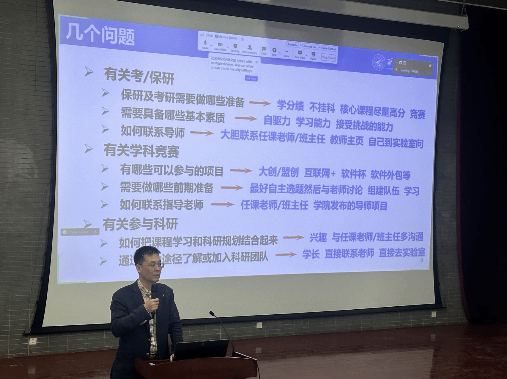 李伟刚副教授针对不同专业方向,详细介绍选修课的规划并提出课程修读建议。针对同学们广泛关注的保研、考研、学科竞赛、参与教师科研项目等问题,他强调学生要加强与导师的联系,将课程学习与科研活动有效结合,并提醒学生要提前为学科竞赛做准备工作。