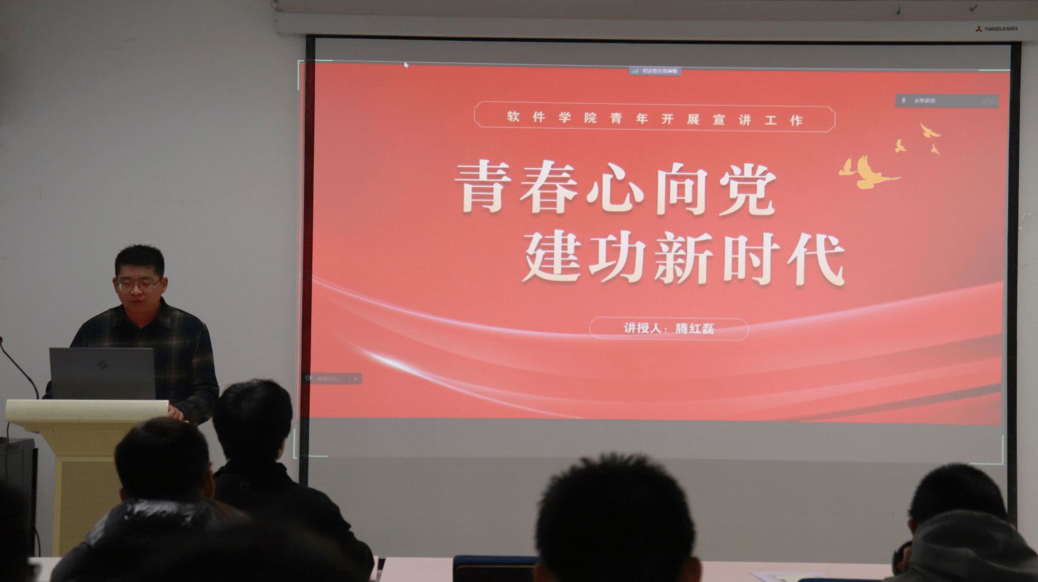 团委书记腾红磊做题为《青春心向党建功新时代》的授课。腾红磊结合自身实际经验和感悟,并结合典型案例说明了当代青年需要具备的各项能力,为在场的团员和青年们讲述了新时代青年的历史使命和责任担当。